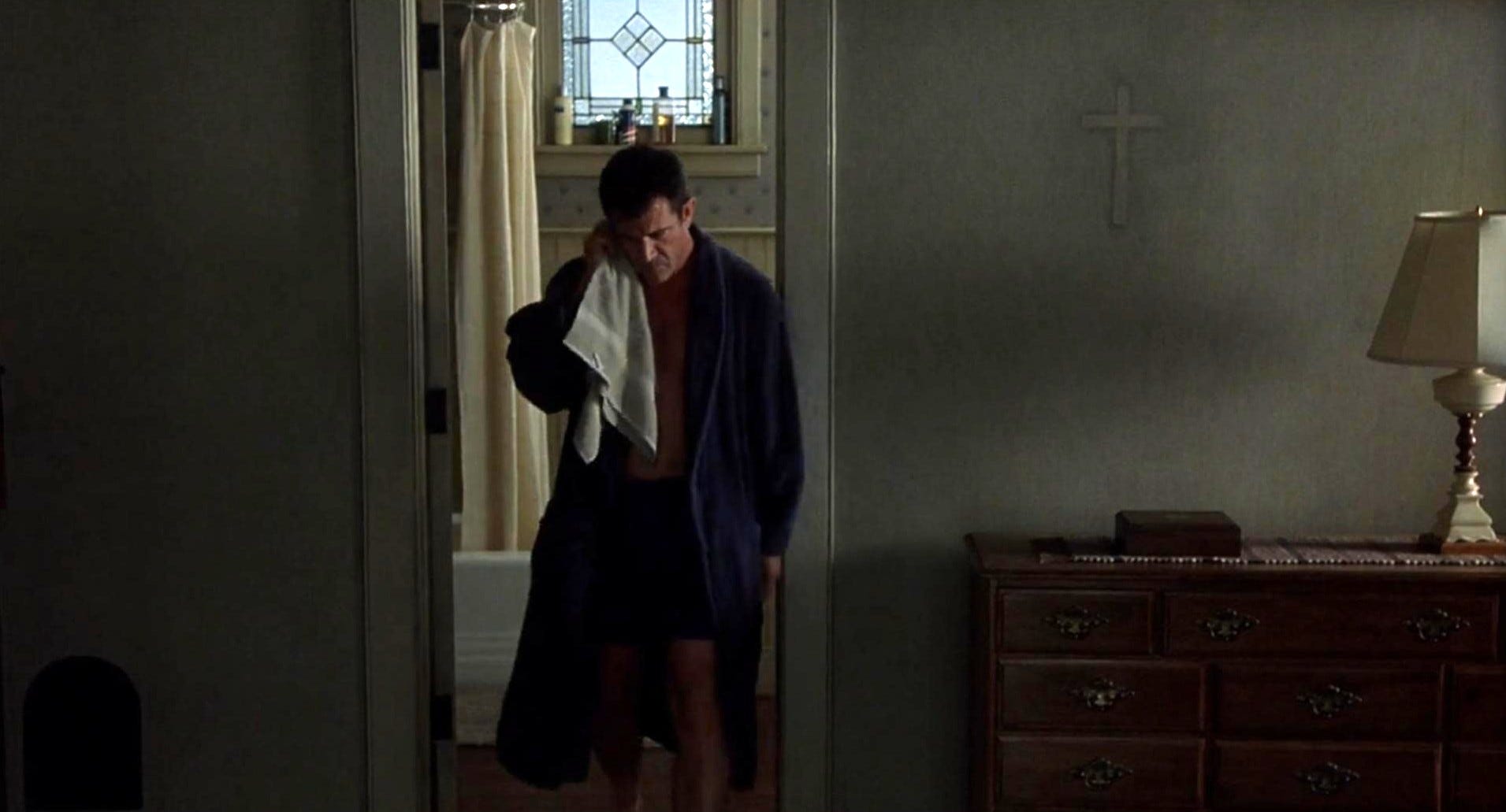 In the final scene, the camera moves backward into the house through a broken window pane, and we watch Morgan recover in Graham’s arms right next to Bo and Merrill in the lush green yard. It slowly pans through the house until we’re back in Graham’s bedroom.7 We’re looking through the windows again, but at a snowy vista this time. Seasons have changed. Time has passed. We stop at the bathroom door—the same shot Shyamalan framed up to show us the conspicuously absent cross that used to hang on Graham’s wall.