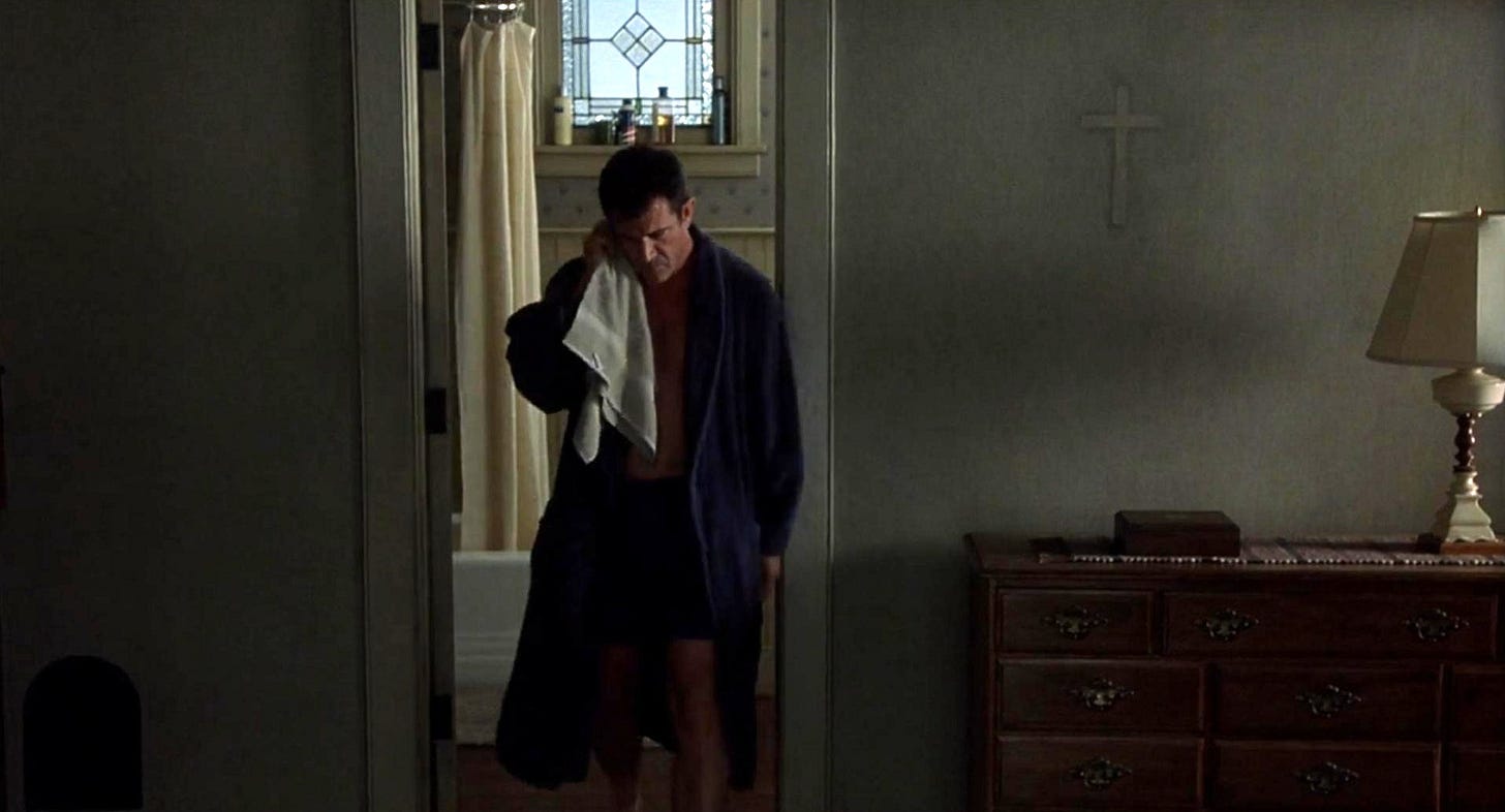 “I sure would feel better if I knew it was just Lionel and the Wolfington brothers.” Graham Hess, a former Episcopal priest, is standing in his cornfield looking at the crop circles his kids found.1 It’s one of the first lines of dialogue we hear from Mel Gibson’s protagonist.2