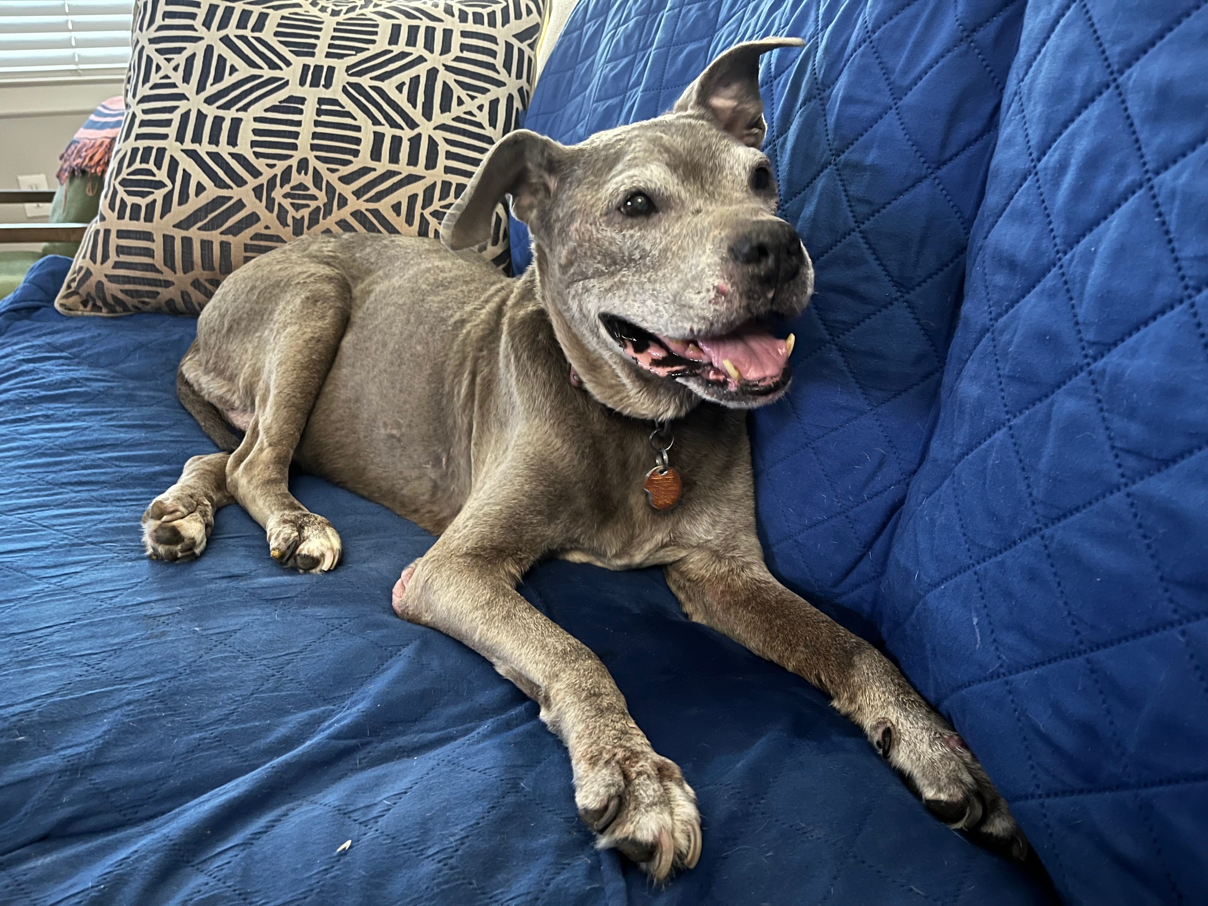 When I arrived, they brought out a three-year-old “blue” pit bull mix that they’d been calling Luna Belle and told me all about her. She’d been found abandoned near a dumpster with her name tag scratched out. Their best guess at her age was an even three years old. It was clear that she’d had a lot of puppies, so it was a safe assumption that she’d been in a puppy mill.